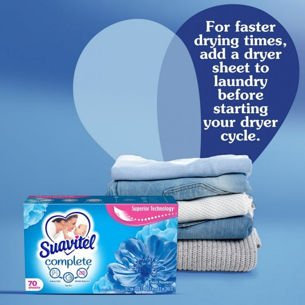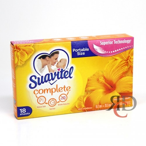 Brighten your day and your laundry with Suavitel Complete Morning Sun, and make it easier than ever to get clothes crisp and clean. The superior formula of Suavitel Complete Fabric Conditioner Dryer Sheets reduces static, reduces wrinkles, and provides Fast Dry benefits, all while leaving your clothes irresistibly fresh.